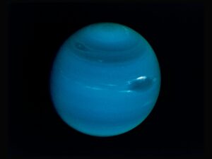 Sa teinte bleu-vert caractéristique provient du méthane présent dans son atmosphère, qui absorbe la lumière rouge et réfléchit le bleu et le vert. Sous ses nuages se cachent de vastes océans d’eau, d’ammoniaque et de méthane sous des pressions et températures extrêmes.